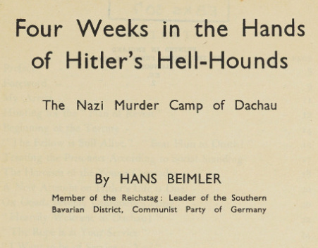 Beimler was arrested in early April 1933 and imprisoned in Dachau. By May 9th, he had managed to escape. His account of what he saw in his few weeks appeared in August 1933. It appeared in English as Four Weeks in the Hands of Hitlers Hell-Hounds: The Nazi Murder Camp of Dachau. (Beimler died in 1936 fighting on the Republican side of Spain’s Civil War.)